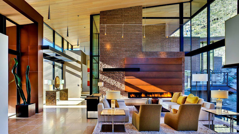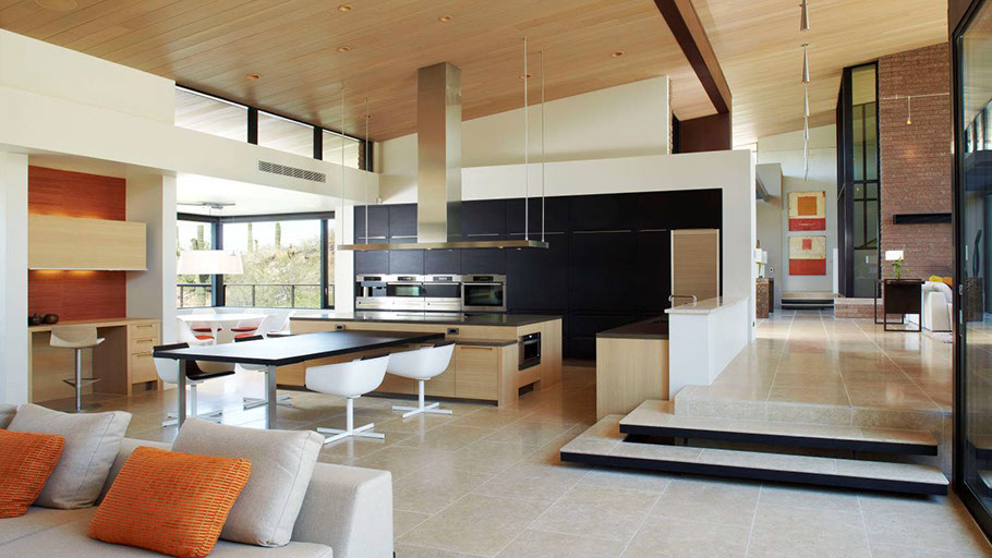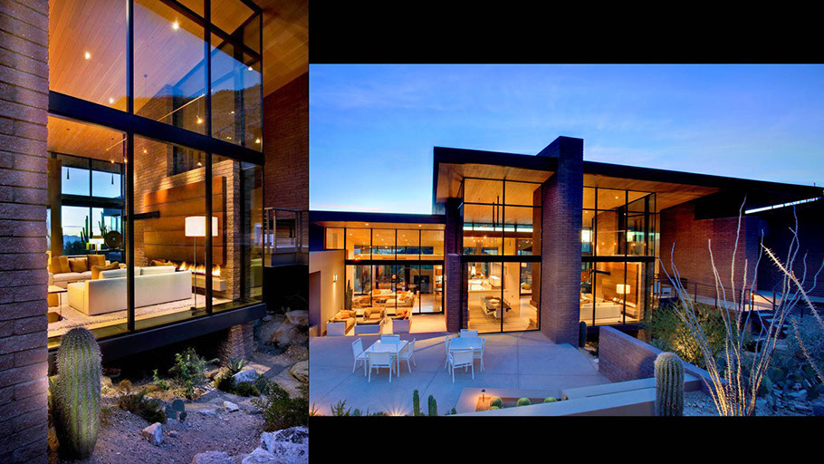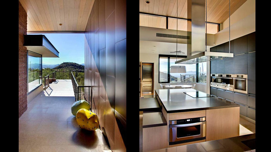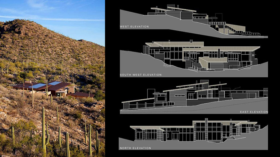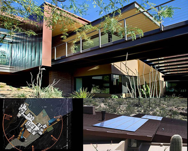 The residence spans across a wash preserving the existing water shed patterns. The entry walk was designed to raise guests up out of the site along this wash. The main living space is located immediately beyond the entrance, providing a striking mountain panorama from the northeast- facing wall of glass. In addition to the site integration, materials were chosen not to contrast with the site, but instead compliment its beauty.There are 72 Solar PV panels installed on the roof. The first full month of Solar PV production showed 115% above the original estimated amounts. This is due to the slope of the roof being optimized for spring and summer solar orientation.