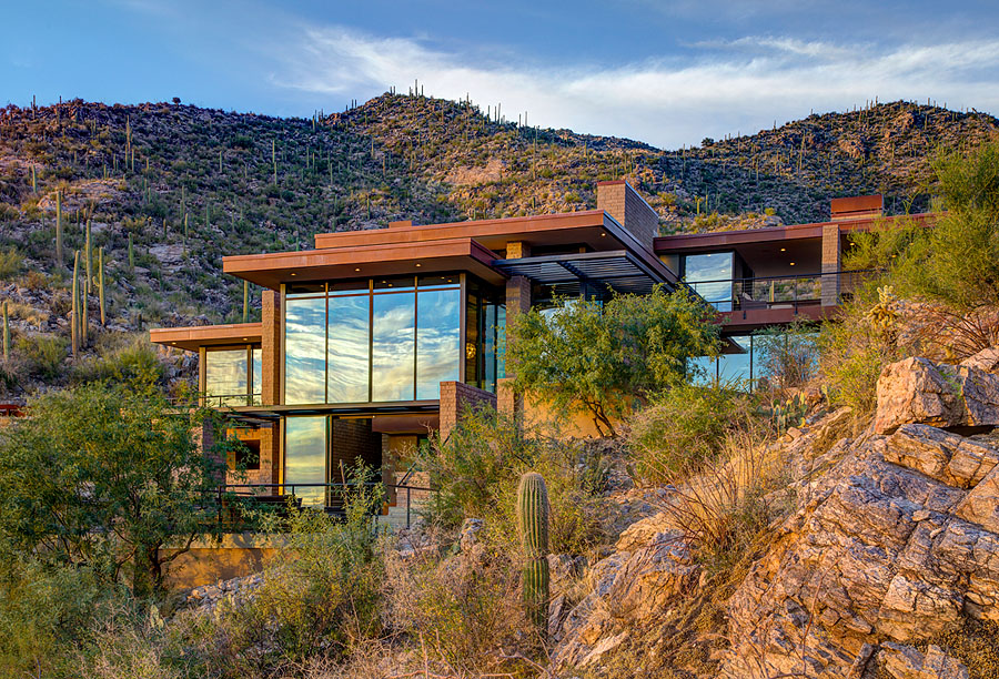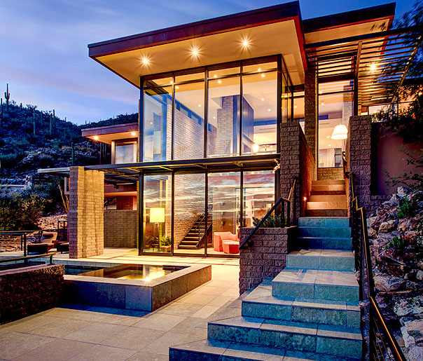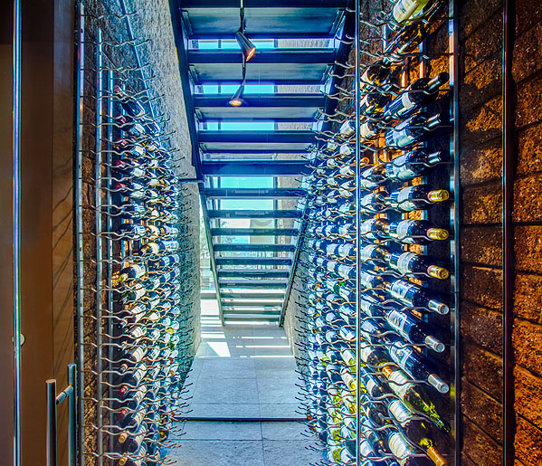 The exterior materials consist of exposed steel, rusted metal, exposed masonry, and glass. The exterior palette continued through to the interior detailing as shown in the transparency of the wine room below the stairs. Despite the low profile of the house and slender lines of the roof, the solar panels that surface the roof are hardly visible. The marriage of site and organic architecture complimented with active technology create a home that is complete in its execution.