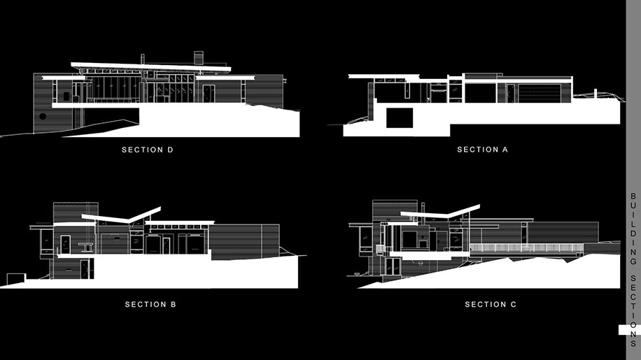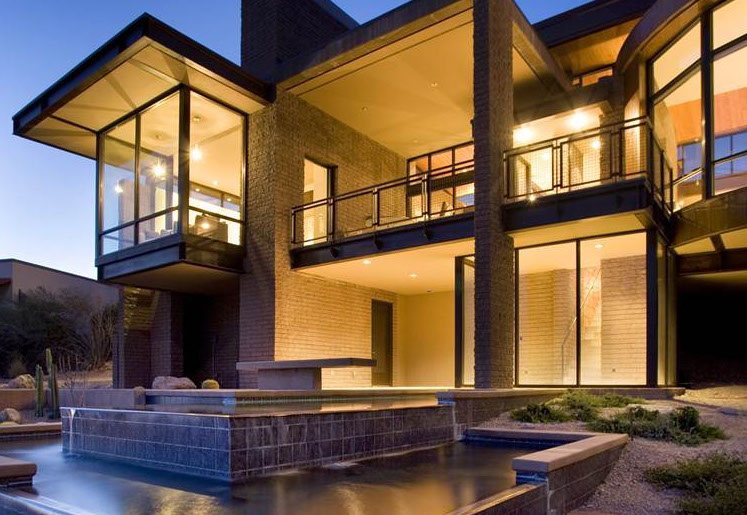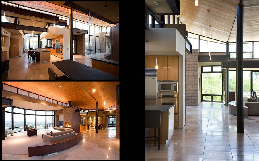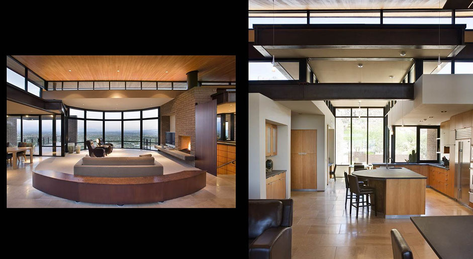 The architecture uses simple geometric shapes to define the spaces. The entry is a forced perspective through the transparent house. The walls are exposed center masonry with raked horizontal joints to complement the horizontal lines of the roof overhangs. The structural steel forms the finished lines of the lower roofs. The central living space is connected by the spine of the wedge shaped upper roof. The lower levels open to a stepping fountain and path that connect to the desert below.