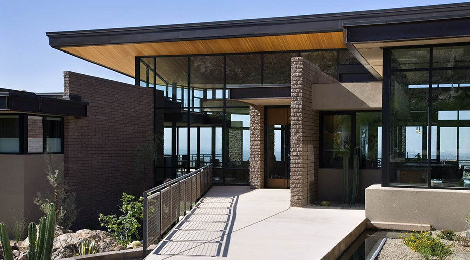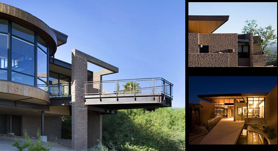 Located in the foothills of the Santa Catalina Mountains, this residence provides exceptional views of the Tucson valley below. The steep sloped site and a natural wash bisecting the middle of the site hindered the already limited level buildable area. It was an early concept to form a bridge of the residence, spanning the wash and cantilevering over the sloped site.