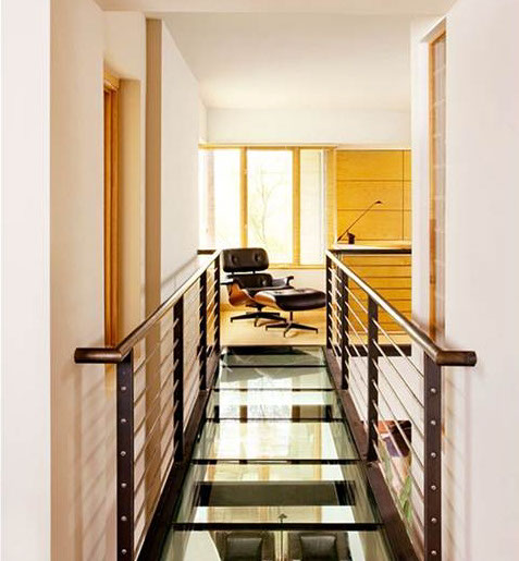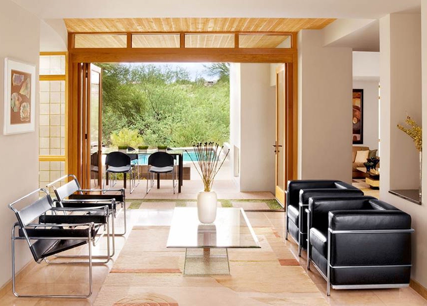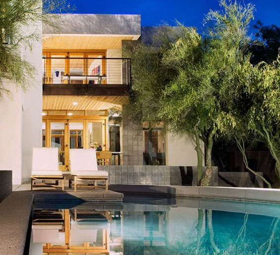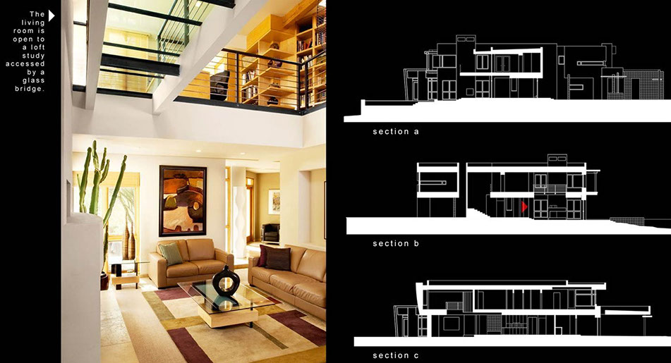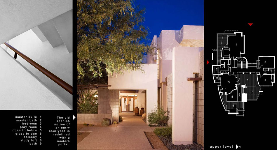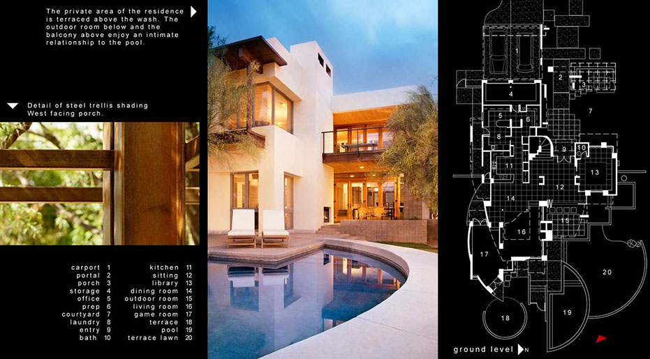 What evolved out of these site restrictions was a narrow, deep house, fit tightly between neighboring homes yet open to a vast sandy wash area in back. Terraces, balconies, courtyards and outdoor room with fireplace all became elements of outdoor living. The wash is an important natural feature that is emphasized throughout the house and divides the residence from the architect’s studio where privacy, yet closeness to family, is enjoyed.