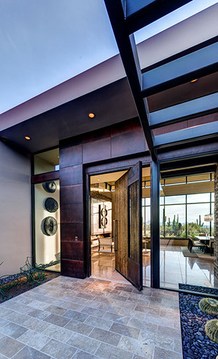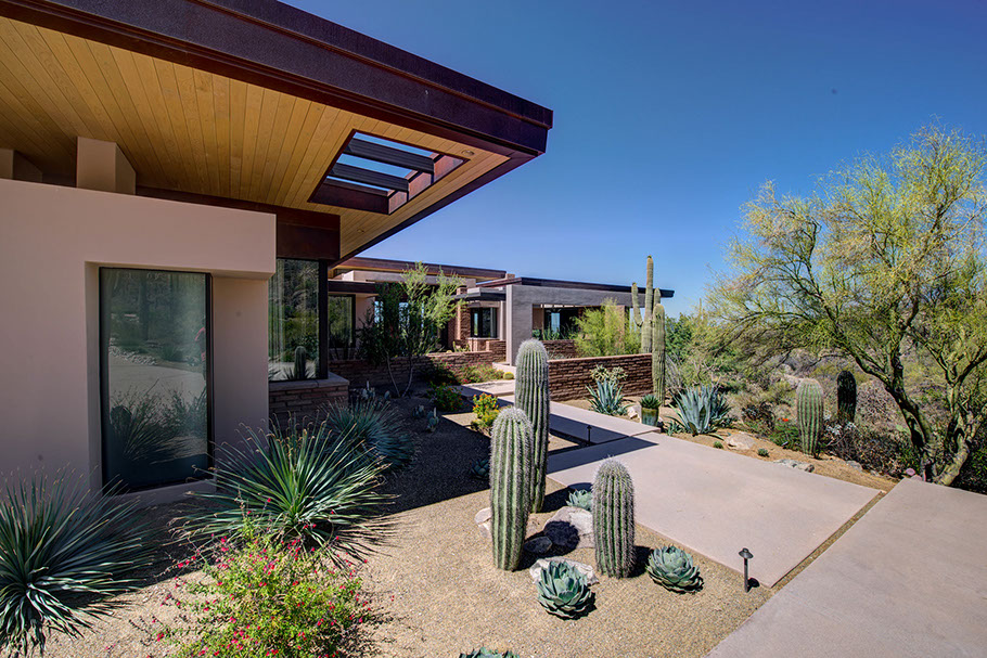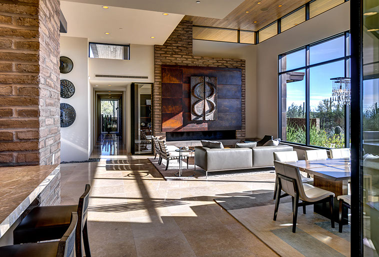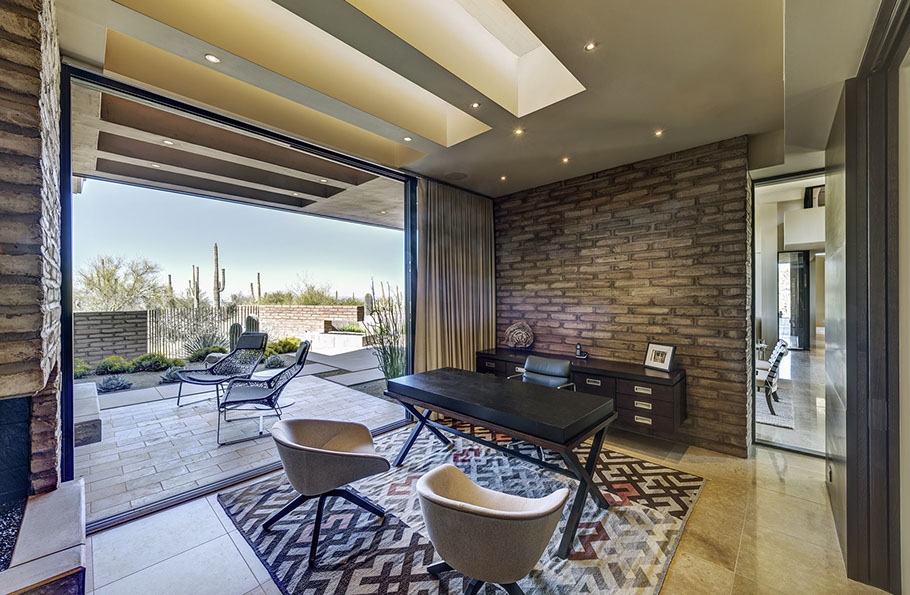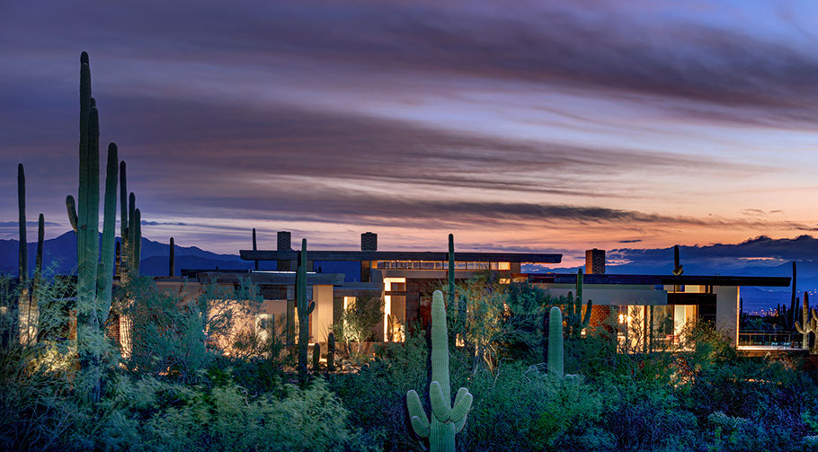 Edges and boundaries are softened with seamless interior glass corners that, while blurring public and private space, also reveal instances of the desert through the rhythm of glass and adobe as one traverses the axis of the home. The regional material hearkens back to the vernacular of desert southwest. Intimately scaled spaces are juxtaposed with the abundant view of the Sonoran desert. Interior skylights and exterior openings in the double roof break up the barrier of inside and outside, with the protected skylights diffusing reflected light into the home.