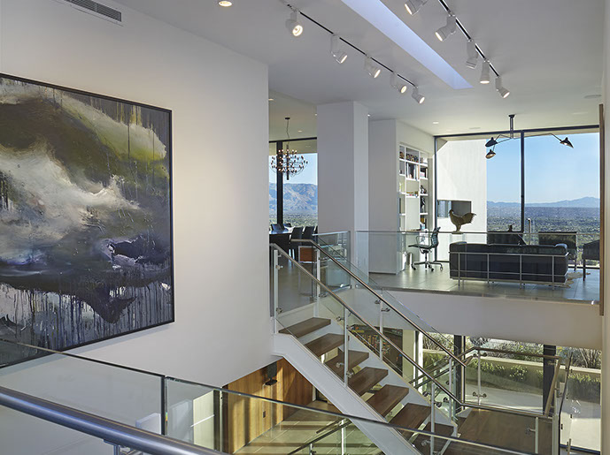 To protect the collection, the architectural concept grew to be a series of juxtaposed shadowboxes with glass panes deeply recessed into thick walls. The Art collection is housed in a two story atrium space that connects the entry on the lower level to the living space above, becoming the connective volume that allows the entire living space to breathe and still view the art. The main living and dining spaces face south, framing the view of the desert below in a perfect unobstructed volume.