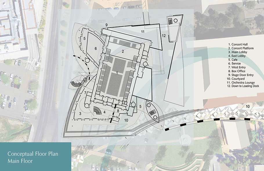 The buildings creates a new symphony hall based on a traditional three level concert hall, with a acoustical perfection. The Symphony Hall would act as the new Tucson icon. The existing hall would be preserved and the new hall would be connected by back of house. The new hall will not turn its back to the city, but instead encourage active urban street life. Sculptural tensile shades would direct visitors from parking areas to the core of the preforming arts center and act as a much-needed way-finding icon to the adjacent convention center.