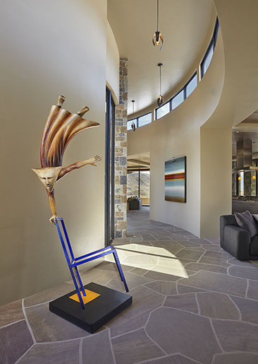 The conceptual diagram of the residence’s curved floor plan locates the density of more private spaces in relation to more public spaces along the circulation spine. More intimate a space the closer to the earth, the more public the space the more open to the outside patio. The public and exposed spaces, requiring the 180-degree views, are elevated out of the earth to create an ample sense of space. High clerestory windows allow natural diffused day-lighting into the earth-sheltered portions of these rooms while the steep hillside blocks direct exposure.